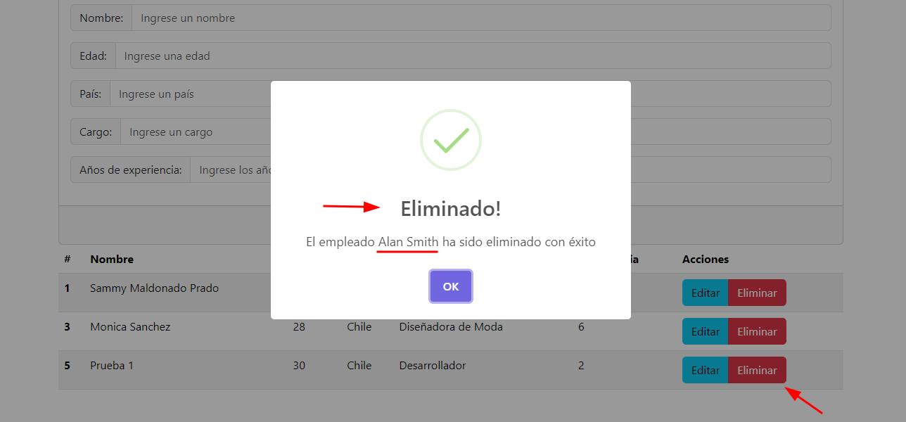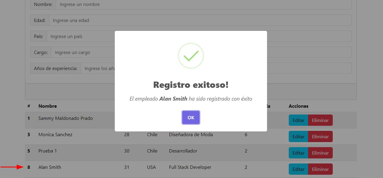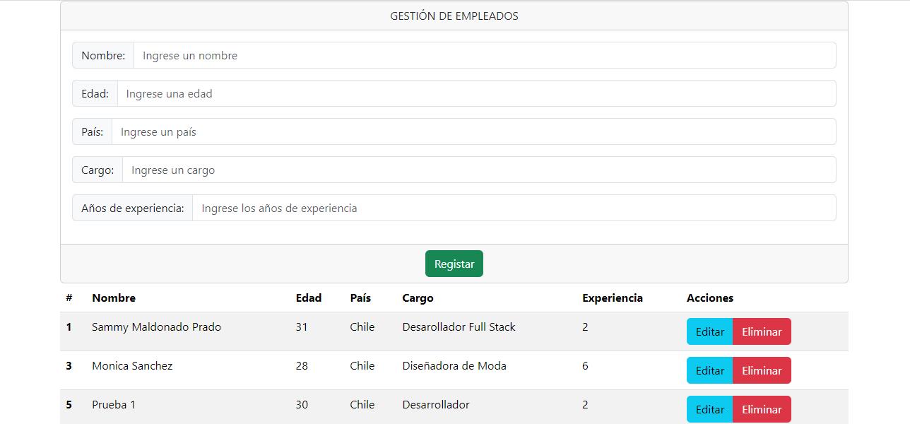 Se incluye la funcionalidad para consultar la lista de empleados actuales, agregar empleados al sistema, actualizar su información y eliminarlos. Todas las acciones se ven ejecutadas en tiempo real mediante la actualización de los estados de los componentes.